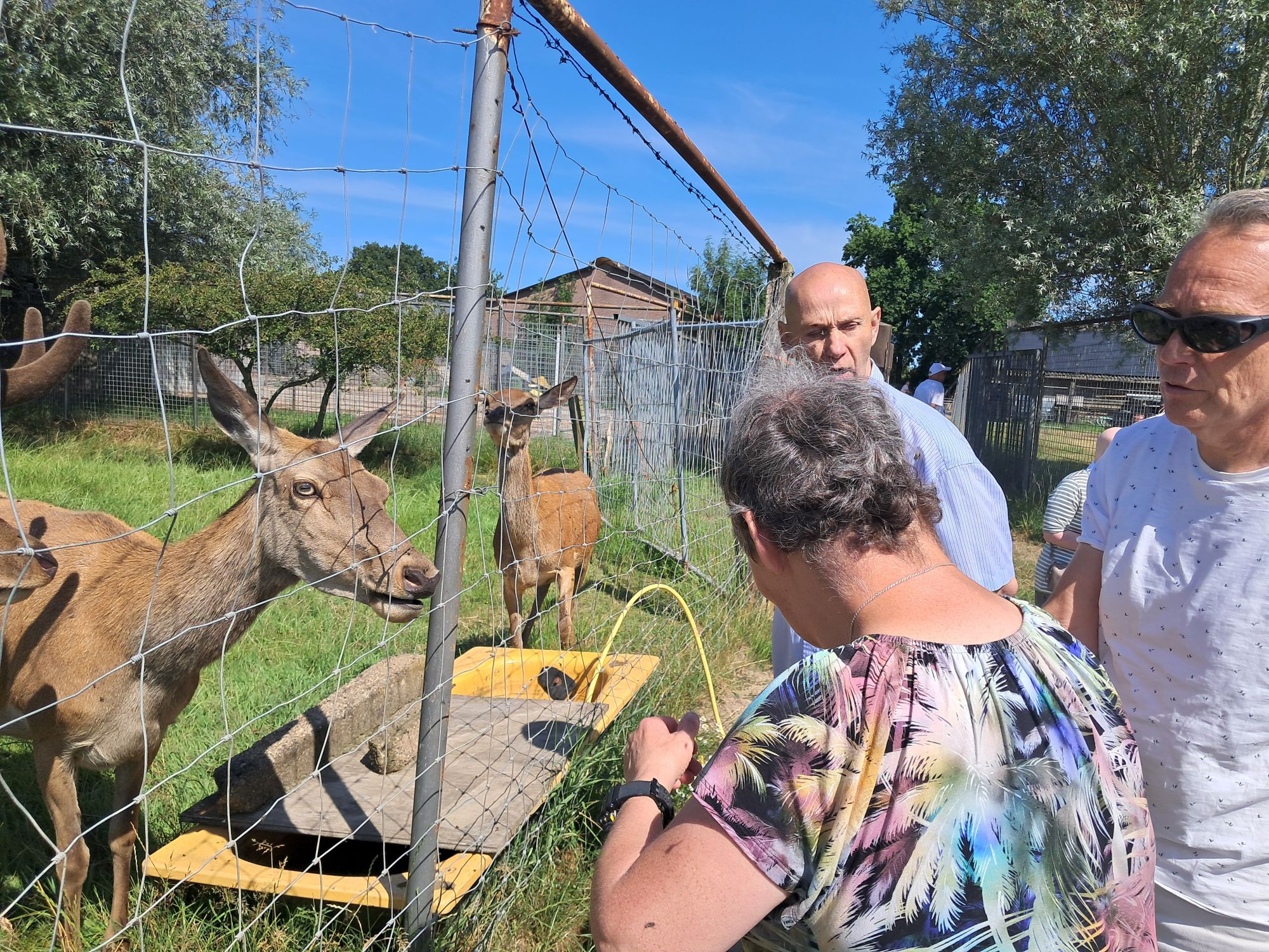 Vanuit MeeReizen in Borne zijn we naar ons vakantiehuis ‘De Pastorie’ in Lage Mierde gereden. Onderweg zijn we naar de Hertenboerderij ‘De Weerd’ in Nijbroek gereden. Hier kregen we koffie met appelgebak en een rondleiding. We hebben ook de herten gevoerd. Daarna hebben we onze lunchpakketjes opgegeten. Onderweg langs de snelweg hebben we nog een koffiepauze ingelast. Het was zonnig en 25 graden. ‘s Avonds zijn we uit eten geweest bij Bojo’s, friet met een snack erbij. Thuis op het terras kregen we nog een ijsje, een kop koffie of thee en een glaasje fris met een knabbeltje erbij.